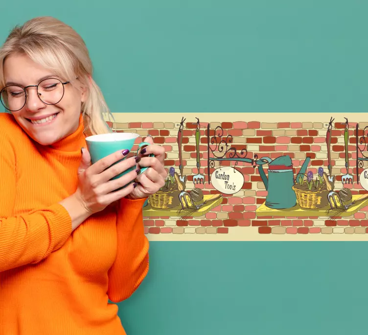 Verleihen Sie Ihrem Raum mit unserer Bordüre selbstklebend für gartenwerkzeuganzeige einen frischen und bunten Look! Das grafische Design kombiniert charmante Elemente wie schrotten, ziegelsteine und eine ansprechende Ziegelwand, während Karikaturen von Geschirr und Küche für eine verspielte Note sorgen. Diese dekorative Rand für Ihren Garten und Haushalt bringt Farbe und Freude in Ihr Zuhause!