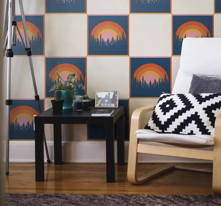 für Ihre Dekoration. Der Entwurf zeigt einen Sonnenuntergang in einer natürlichen Landschaft. Die Anwendung ist einfach und das Ergebnis ist eine wunderschöne Wanddekoration. Das Design wird in einem Packset geliefert, aus dem Sie die passende Packung für die Größe und Dekoration Ihres Raums auswählen können. Das wasserdichte Vintage-Sonnenfliesen-Abziehbild ist faltenfrei und jederzeit leicht zu entfernen. Es besteht aus hochwertigem Material und ist sehr langlebig. Legen Sie es in den Warenkorb und fahren Sie mit der Zahlung fort, um Ihrem Raum eine einzigartige Note zu verleihen.Bestellen Sie jetzt!