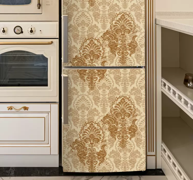 Entdecken Sie die atemberaubende Folie Kühlschrank im eleganten vintage-muster, die Ihrem Kühlschrank einen Hauch von klassischem Charme verleiht. Dieses kunstvoll gestaltete Design ist mit verzierten und dekorativen Ornamenten geschmückt, die an blühende Blumen erinnern. Die Kombination aus goldenen Akzenten und einem klassischen Stil macht jeden Blick darauf zu einem Erlebnis für die Sinne!