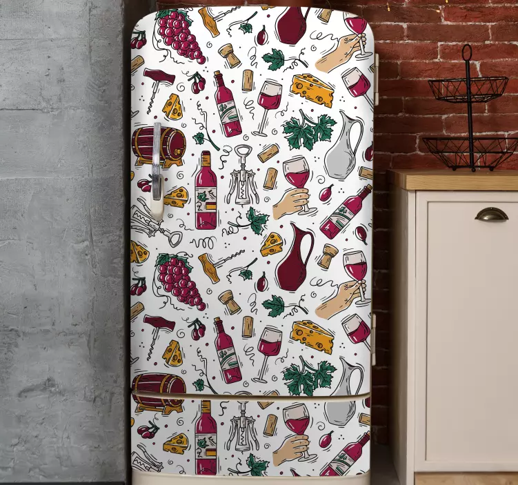 Entdecken Sie die kreative Welt unseres Folie Kühlschrank im food- und weinthema, das mit einem ansprechenden Design begeistert. Die handgemalten Muster zeigen Kühlschränke, Weingläser, Flaschen und Weintrauben, die perfekt harmonieren. Kulinarische Elemente wie Käse und eine fröhliche Atmosphäre machen diesen Aufkleber zu einem einzigartigen Blickfang in Ihrer Küche. Genießen Sie die Verbindung von Kunst und Genuss in einem inspirierenden Produkt, das jeden Feinschmecker anspricht!