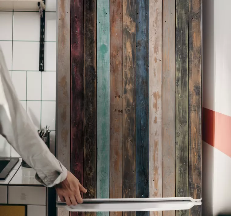 Unser Folie Kühlschrank im Landhausstil aus Holz ist ein wahres Kunstwerk für Ihre Wohnwand. Mit einem rustikalen Design, das in vertikalen Brettern gemalt ist, bringt es lebendige Farben und eine strukturierte Optik in Ihr Zuhause. Die Kombination aus Holz und bunten Akzenten schafft eine einladende Atmosphäre und verwandelt Ihren Kühlschrank in ein stilvolles Möbelstück.