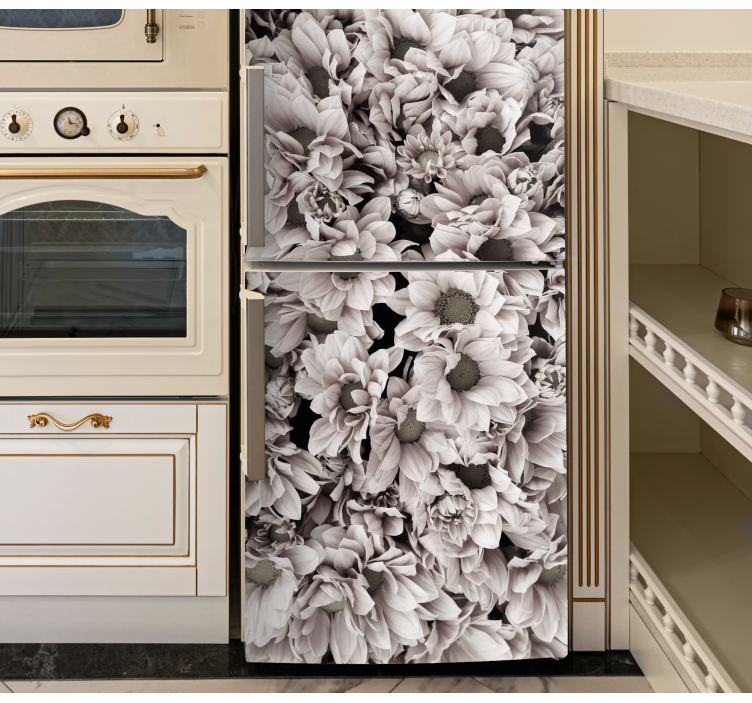 Entdecken Sie die wunderschöne Folie Kühlschrank mit elegantem blumenmuster, die Ihrem Kühlschrank ein frisches und stilvolles Aussehen verleiht. Das ansprechende Design zeigt realistische Pfingstrosen in einem harmonischen Schwarz-Weiß-Kontrast, der in jede Küche passt. Die floralen Motive bringen die Schönheit der Natur direkt in Ihr Zuhause und sorgen für eine elegante Atmosphäre in Ihrem Raum.