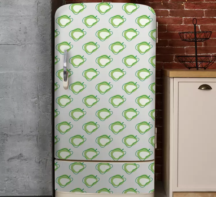 Entdecken Sie die erfrischende Welt unseres Folie Kühlschrank mit fruchtmuster design! Dieses einzigartige Design, das gekritzelte Elemente und fruchtige Motive wie Äpfel in einem lebendigen Grünton kombiniert, bringt frischen Wind in Ihre Küche. Der Kühlschrank wird zum echten Hingucker und verleiht Ihrem Raum eine verspielte Note, die Ihre Gäste begeistern wird!