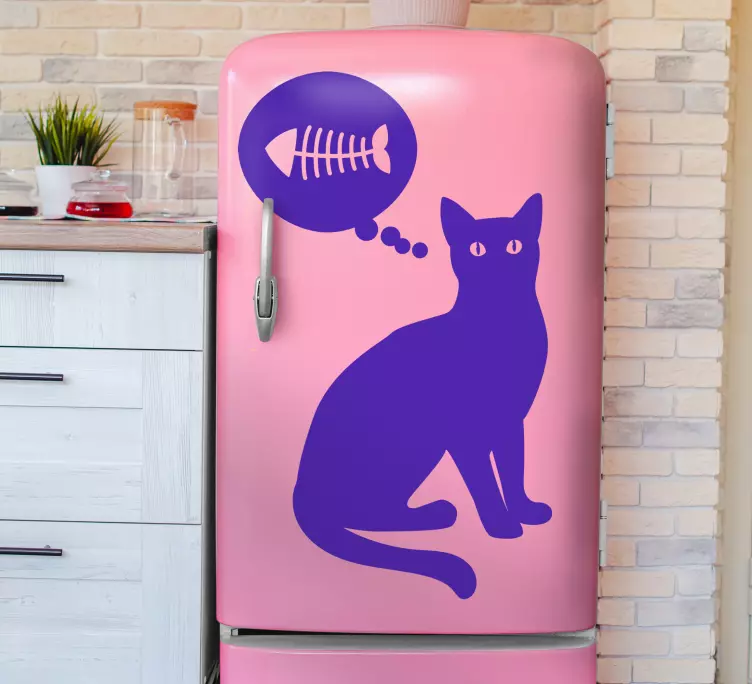 Die Folie Kühlschrank nachdenkliche katzen-silhouette ist ein wahrhaft künstlerisches Design, das die Silhouette einer nachdenklichen Katze zeigt, die über einen Fisch nachsinnt. Diese komische Darstellung mit einer Gedankenblase macht jede Küche zu einem Ort voller Charme und Kreativität. Die Katze und die Gräten sind so geschickt gestaltet, dass sie sowohl künstlerisch als auch humorvoll wirken, und verleihen Ihrer Einrichtung einen verspielten Akzent.