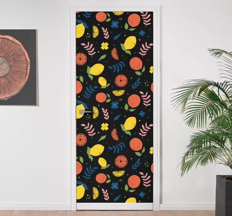 Ein Tür-Aufkleber wie dieser verwandelt jede Tür in ein kreatives Kunstwerk. Er sorgt nicht nur für Farbe und Frische, sondern bietet auch eine einfache Möglichkeit, Ihrem Raum einen neuen Stil zu verleihen. Mit diesem Aufkleber können Sie eine langweilige Oberfläche in einen lebendigen Mittelpunkt verwandeln. Die Kombination aus Zitrusfrüchten und floralen Mustern bringt die Natur in Ihr Zuhause und sorgt für gute Laune – perfekt für jeden Raum!