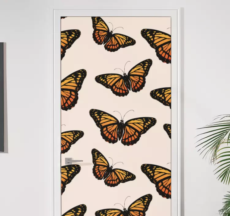 Verleihen Sie Ihrer Tür mit unserem Tür-Aufkleber mit bunter Schmetterlingsillustration einen Hauch von Natur und Frische! Dieses atemberaubende Grafikdesign zeigt majestätische Monarch-Schmetterlinge in lebendigen orange Tönen, die in einem harmonischen Muster angeordnet sind. Die dekorativen Schmetterlinge bringen Farbe und Leben in jeden Raum. Lassen Sie Ihre Tür zum Blickfang werden und genießen Sie die Schönheit der Natur in Ihrem Zuhause!