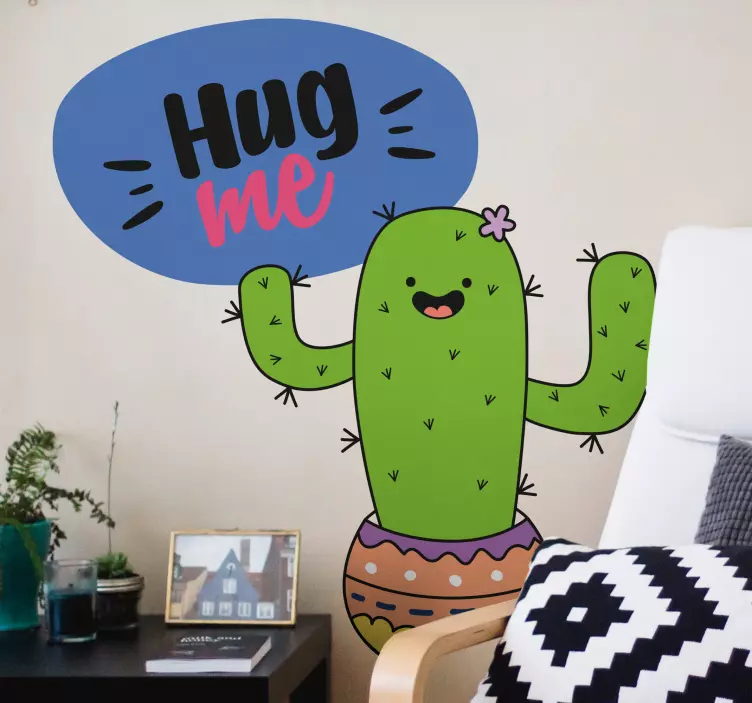 Referenz: A46921Ein fröhlicher Kaktus-Charakter mit einem freundlichen Lächeln, geschmückt mit einer lebhaften Blume und einem bunten Topf. Er hat eine verspielte Sprechblase mit dem Text, der zu Umarmungen ermutigt, was dem gesamten Design eine unbeschwerte Note verleiht.