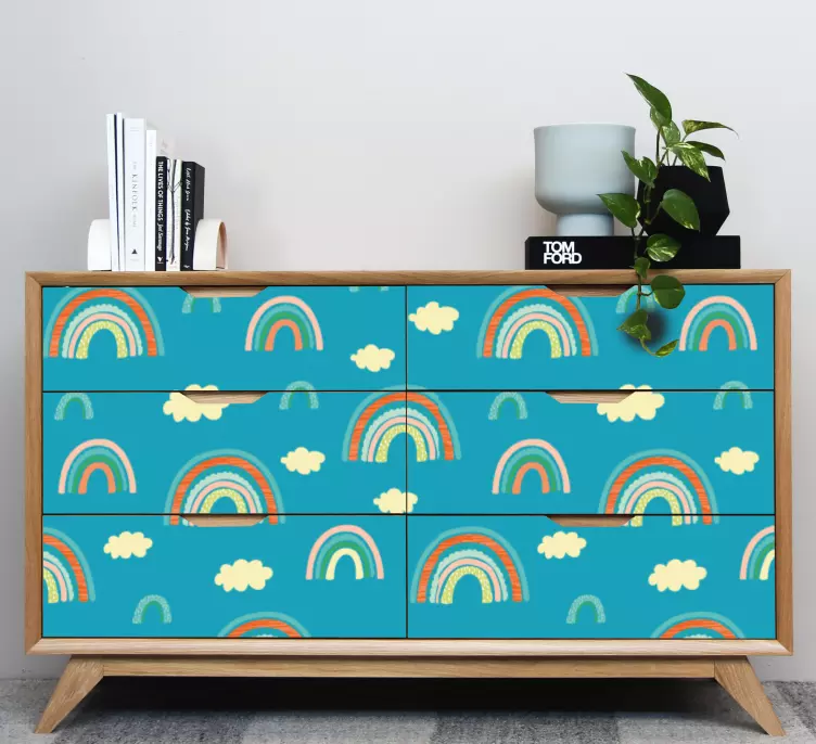 Ändern Sie das Aussehen Ihrer Möbeloberfläche mit diesem selbstklebenden Möbelaufkleber. Der beruhigende, einfarbige Hintergrund und die Regenbogenillustrationen schaffen eine fröhliche Atmosphäre in Ihrem Zuhause.