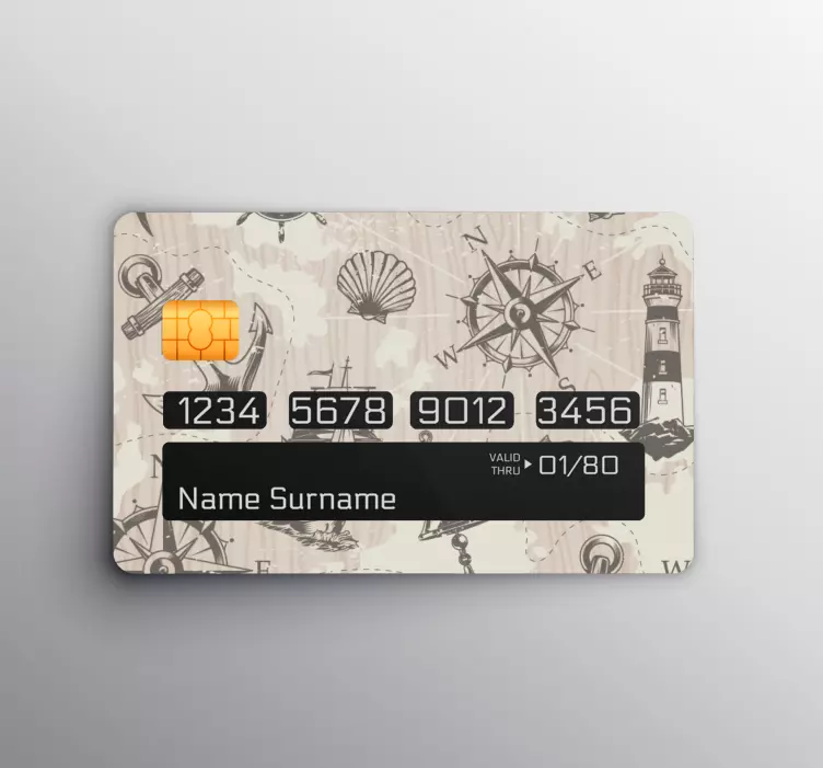 Entdecken Sie unseren einzigartigen Kreditkarte Aufkleber maritimes design, der mit seinem faszinierenden grafischen Design besticht. Dieser Aufkleber zeigt ein wunderschönes Muster mit nautischen Illustrationen, darunter Anker, Leuchttürme und Kompasse, die das Gefühl von Meer und Abenteuer hervorrufen. Der Aufkleber hat eine ansprechende Holzoptik und ist ideal, um Ihre Kreditkarte auf kreative Weise zu verschönern. Verleihen Sie Ihrer Kreditkarte einen Hauch von maritimer Eleganz!