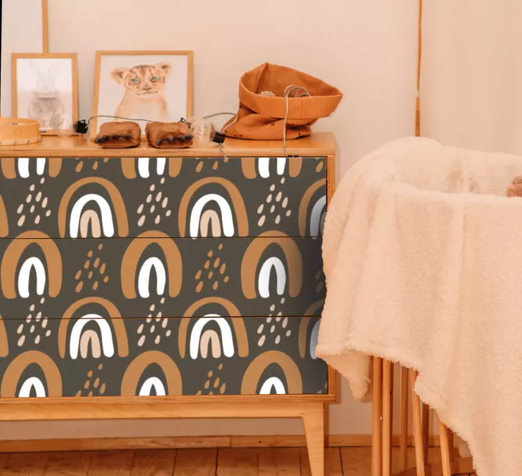 Entdecken Sie die Möbelfolie bunte bogenmuster, die mit ihrem farbenfrohen und spielerischen Design begeistert. Dieses einzigartige Produkt zeigt eine harmonische Kombination aus Regenbögen und Regentropfen, die die geometrischen Muster lebendig wirken lassen. Die Struktur der Folie ist modern und bringt frischen Wind in Ihre Möbel, wodurch sie zu echten Hinguckern in jedem Raum werden.