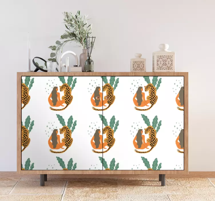 Verleihen Sie Ihren Möbeln mit unserer Möbelfolie leoparden pflanzenmotiv ein tropisches Flair! Das handgemalte Design zeigt eine wunderliche Frau umgeben von Leoparden und üppigen Pflanzen, die das Gefühl von Natur und Freiheit verkörpern. Die harmonische Kombination aus Tiermotiv und botanischen Elementen bringt Leben in jeden Raum und verwandelt Ihre Möbel in echte Kunstwerke.