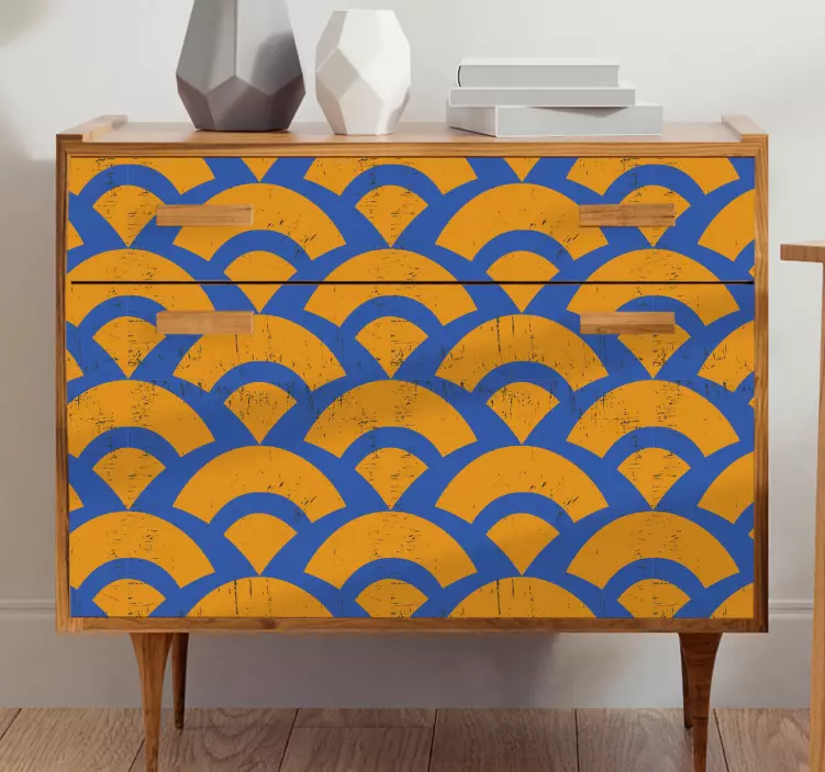Entdecken Sie die faszinierende Möbelfolie wellenmuster Überlagerung, die durch ihr grafisches Design begeistert. Mit einem harmonischen Zusammenspiel aus geometrischen Formen in Blau und Orange erzeugt dieses minimalistische und abstrakte Muster eine lebendige Atmosphäre in Ihren Wohnräumen. Die sanften Wellen verleihen Ihren Möbeln eine frische Note und verwandeln jeden Raum in ein stilvolles Ambiente.