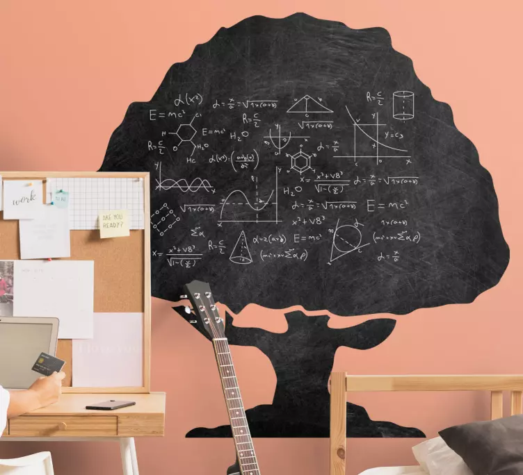 Referenz: A48895Eine auffällige Silhouette eines Baumes zeigt wissenschaftliche Gleichungen und Diagramme, die in sein Design integriert sind und die Verschmelzung von Natur und Wissen symbolisieren. Dieses Design verkörpert einen kreativen Studienraum, der Lernen und Neugier inspiriert und somit perfekt für Bildungsumgebungen ist.