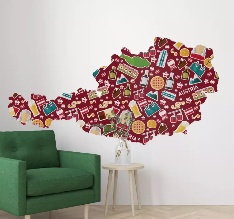 Verleihen Sie Ihrem Zuhause einen Hauch von österreichischer Kultur mit diesem einzigartigen Wandtattoo. Es handelt sich um einen wunderschönen Österreich Landkarten Wandaufkleber, der mit vielen lustigen Features wie Musik, Städten, Getränken, Flaggen und mehr auf rotem Hintergrund mit mehrfarbigen Features gestaltet ist. Diese Features beschreiben die Aktivitäten und das Glück, die junge Menschen an diesem Ort finden können.
