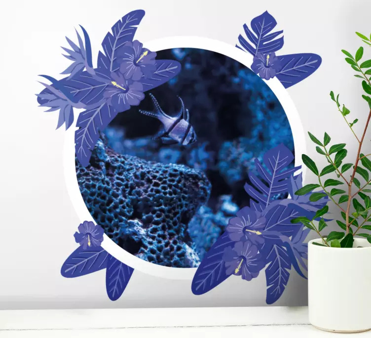 Referenz: A48297Eine immersive Unterwasserszene, die lebendige Korallen mit einem Fisch zeigt, der zwischen den Strukturen schwimmt. Um die Szene herum befinden sich üppige, tropische Blätter, die ein Gefühl von Tiefe und Leben verleihen. Diese natürliche Umgebung weckt Gefühle von Ruhe und Erkundung.