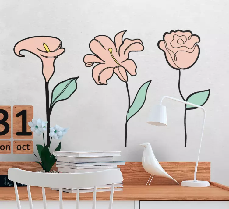 Verleihen Sie Ihrem Raum einen Hauch von Eleganz mit unserem Wandtattoo Blumen anmutige Blumenkomposition. Dieses bezaubernde Design zeigt eine harmonische Anordnung von Blumen, die in einer raffinierten Zeichnung dargestellt sind. Die sanften Pastellfarben bringen die Natur direkt in Ihr Zuhause und schaffen eine botanische Atmosphäre, die sowohl dekorativ als auch beruhigend wirkt.