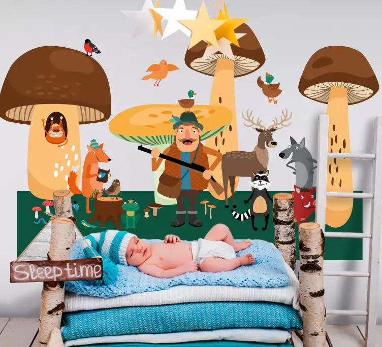 Referenz: A49201Eine bezaubernde Szene mit einer Vielzahl von verspielten Tieren in einer Waldumgebung. Dazu gehören fantasievolle Pilze und eine fröhliche Figur, die mit der Tierwelt interagiert. Perfekt, um eine magische Atmosphäre in Kinderbereichen zu schaffen, die die Fantasie anregt und die Liebe zur Natur fördert.