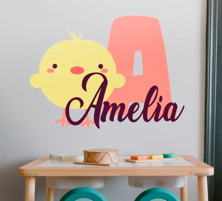Referenz: A48924Ein charmantes Küken-Design zeigt ein freundliches gelbes Küken neben einem bunten Initial und einem anpassbaren Namen. Dieses verspielte Element ist perfekt, um eine reizvolle Atmosphäre im Kinderzimmer zu schaffen und Wärme sowie Individualität in ihren Raum zu bringen.