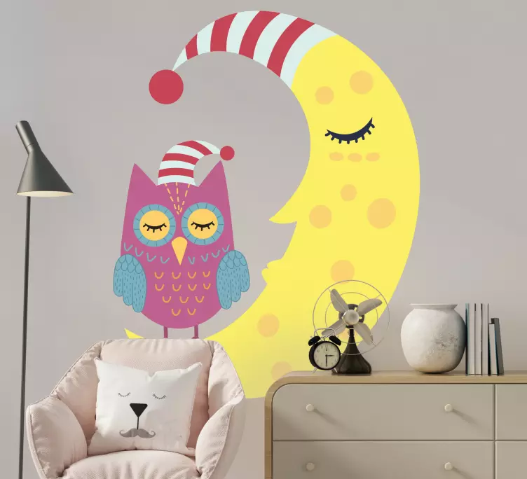 Referenz: A48956Eine entzückende Szene mit einer gemütlichen Eule, die auf einem Halbmond sitzt, beide geschmückt mit verspielten Mustern. Das charmante Design ist perfekt, um eine fantasievolle Atmosphäre im Kinderzimmer zu schaffen und während der Nacht Ruhe und Vorstellungskraft zu fördern.