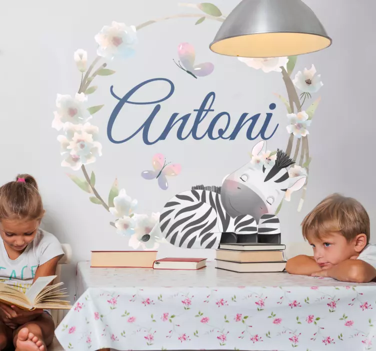 Referenz: A49681Eine charmante Blumenkomposition mit einem verspielten Zebra, umgeben von zarten Blumen und Schmetterlingen. Das Design lädt zu einem verspielten Touch ein, perfekt für Kinderzimmer. Mit Anpassungsoptionen erhältlich, verleiht es eine persönliche Note und ist somit eine ideale Wahl für Krippen oder Spielzimmer.