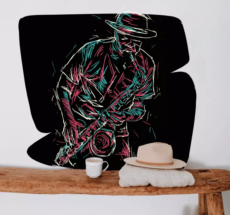 Entdecken Sie unser einzigartiges Wandtattoo musik saxophonist spielt, das eine aufregende grafische Darstellung eines Jazzmanns bietet, der mit Leidenschaft sein Saxophon spielt. Das Design ist abstrakt und fängt die Essenz der Musik perfekt ein, während es mit einer dynamischen Zeichnung die Atmosphäre von Jazz und Leistung vermittelt. Der stilvolle Hut des Musikers verleiht dem Gesamtbild eine elegante Note und zieht die Blicke auf sich!