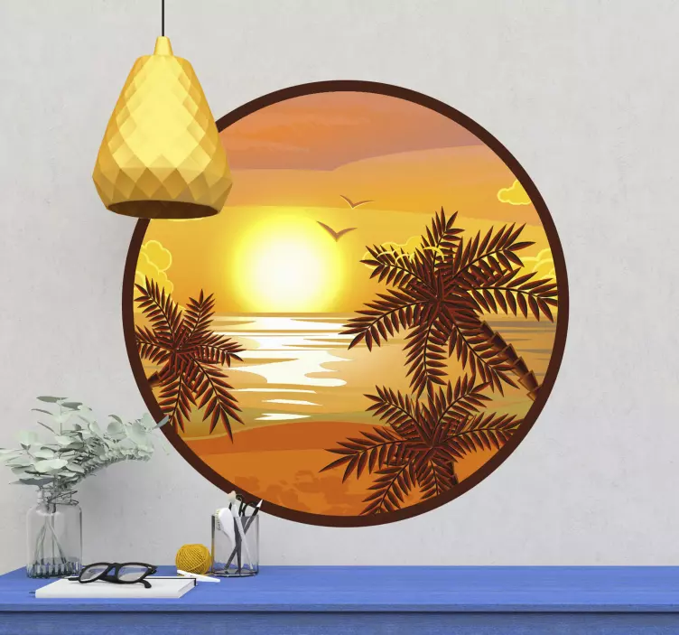 Entdecken Sie unser einzigartiges Wandtattoo Natur ruhiger Sonnenuntergang Blick, das Ihre Wände in eine tropische Oase verwandelt! Das grafische Design zeigt einen beeindruckenden kreisförmigen Sonnenuntergang über dem Ozean, umgeben von majestätischen Palmen und einem ruhigen Strand. Dieses heitere Kunstwerk bringt die Schönheit der Natur direkt in Ihr Zuhause und schafft eine entspannende Atmosphäre, die zum Träumen einlädt.