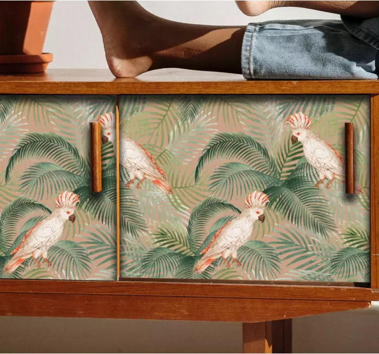 Referenz: A53598Mit lebhaften Papageien zwischen üppigen Palmenblättern vermittelt dieses Design eine tropische Atmosphäre. Die bunten Vögel ergänzen das reiche grüne Laub und schaffen eine lebendige und erfrischende Szene. Ideal, um einen Hauch von Natur in Innenräume zu bringen, verleiht es jedem Raum Wärme und Freude.