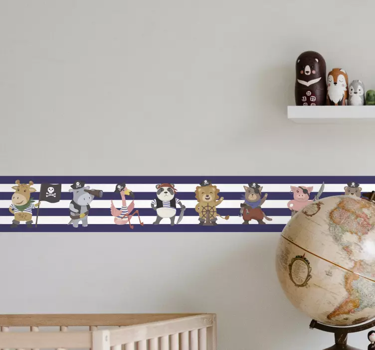 Referenz: A47219Eine lebendige Sammlung von piratenthemenbezogenen Tiercharakteren, die in verspielten Posen präsentiert werden. Jedes Tier trägt verschiedene Piratenaccessoires, die eine reizvolle und abenteuerliche Atmosphäre schaffen, die perfekt für Kinderbereiche ist. Das Design enthält Streifen, die ein stilvolles maritimes Element zum Gesamtthema hinzufügen.