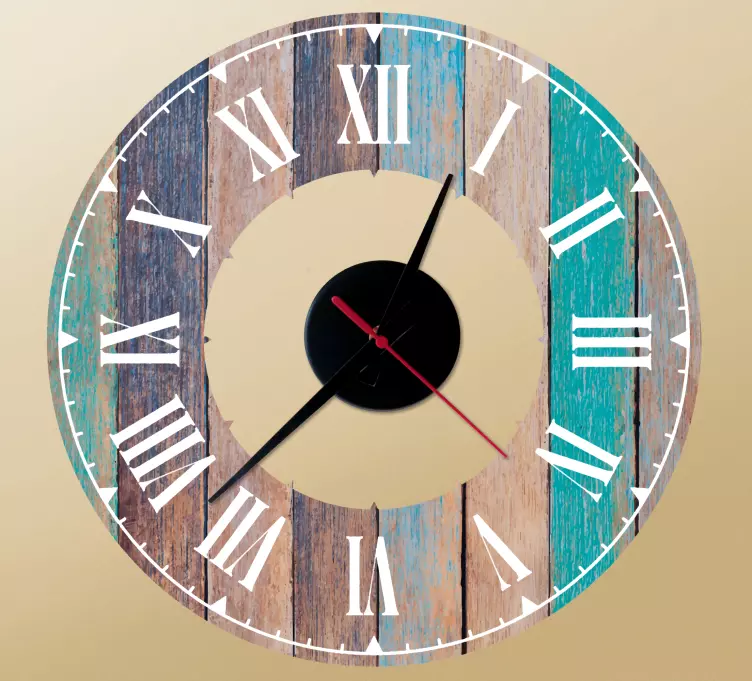 Referenz: A49324Dieses Design verfügt über ein charmantes Ziffernblatt mit einer Vielzahl von römischen Ziffern, die um einen kreisförmigen Holz-Effekt angeordnet sind. Die Kombination aus Farben und Texturen verleiht ein rustikales Gefühl und macht es zu einer eleganten Ergänzung für jeden Wohnraum.