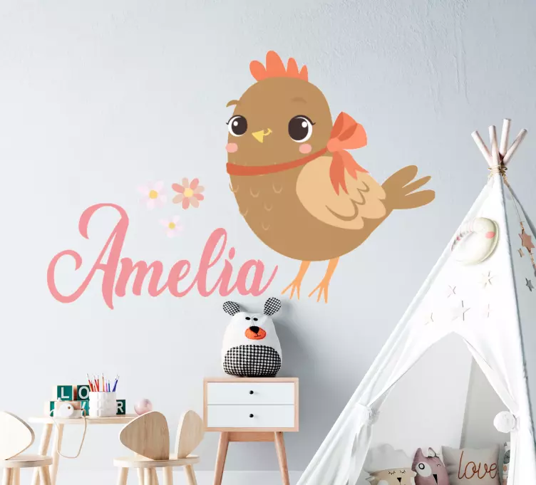 Referenz: A48923Eine charmante Darstellung eines Vogels mit einer Schleife, umgeben von kleinen Blumen. Dieses verspielte Design eignet sich perfekt zur Personalisierung eines Kinderzimmers und bringt eine Prise Wärme und Freude in jede Umgebung. Der Charakter weckt Gefühle von Lebhaftigkeit und Unschuld.