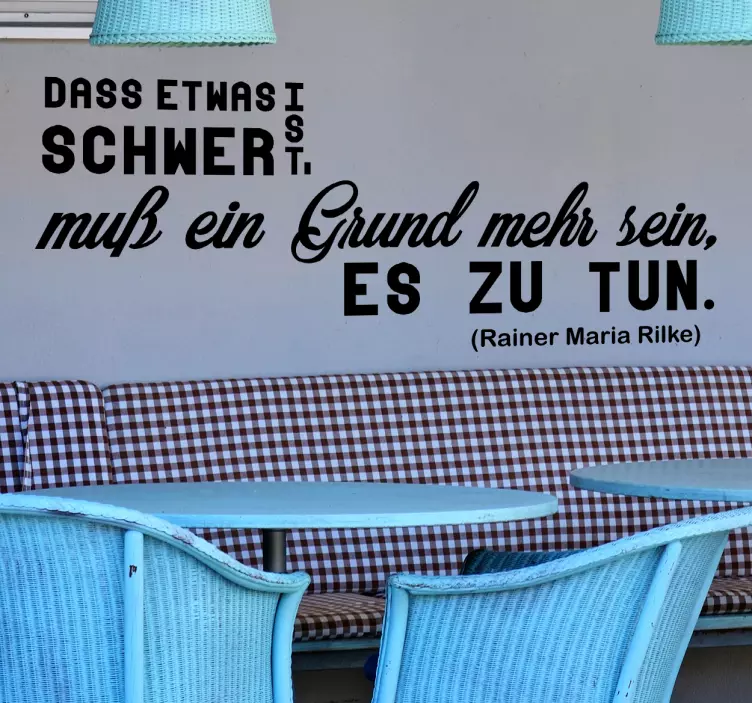 Referenz: A11350Das Wandtattoo mit dem Zitat von Rilke eignet sich perfekt, um das Wohnzimmer ein wenig aufzuwerten und daran zu erinnern, sich auch mal in schwierigen Situationen durchzubeißen.