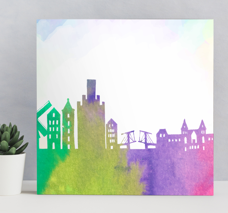 Entdecken Sie die faszinierende Leinwandbild stadt-silhouette skyline, die mit einem atemberaubenden Aquarelldesign begeistert. Diese künstlerische Handmalerei zeigt die ikonischen Wahrzeichen der Niederlande und fängt die bunten Farben des Horizonts ein. Jedes Detail dieser Stadt-Silhouette vermittelt das lebendige Gefühl einer urbanen Landschaft und verwandelt jeden Raum in eine inspirierende Oase der Kunst.