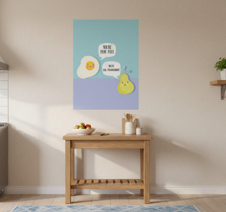 Referenz: G588Entdecken Sie unser einzigartiges Poster Küche Ei und Birne Wortspiel, das mit einem charmanten Design begeistert. Die harmonische Komposition aus frischen Farben und witzigen Illustrationen zieht sofort die Aufmerksamkeit auf sich. Dieses Poster vermittelt eine fröhliche Atmosphäre und eignet sich perfekt für jede Küche. Die hohe Farbintensität und das halbmattierte Finish sorgen dafür, dass das Poster sowohl tagsüber als auch abends zur Geltung kommt und keine Reflexionen aufweist.