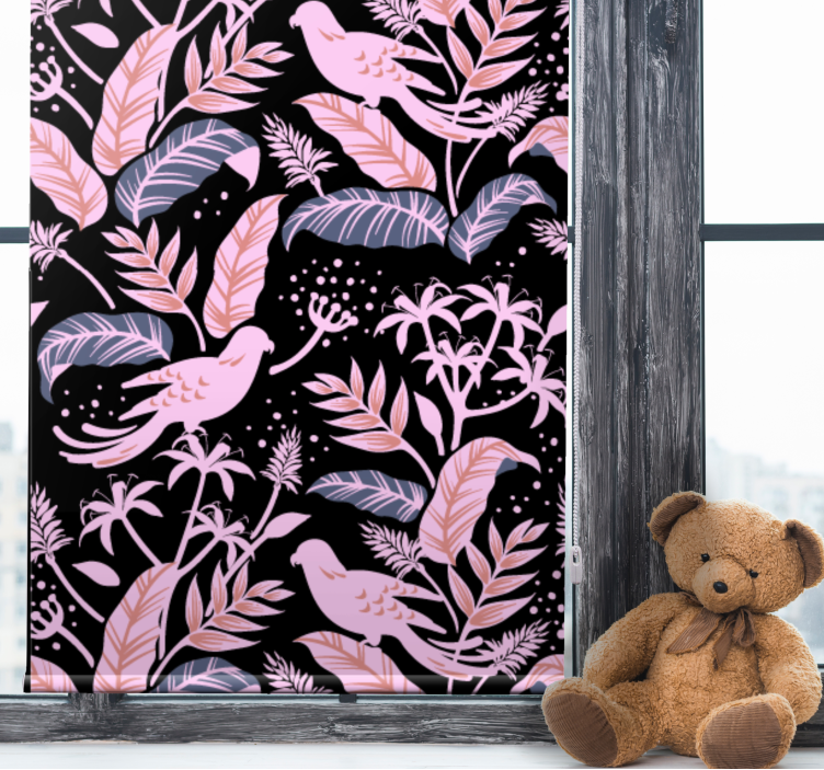 Entdecken Sie das faszinierende Design unseres Rollos mit Fenster weitere Tiere tropische vogelmotive, das Ihren Raum mit lebendigen Bildern von Vögeln und Blättern in sanften Rosa und floralen Mustern bereichert. Dieses wunderbare Rollo verwandelt Ihr Fenster in eine Oase der Natur und bringt die Farben und Formen der tropischen Flora direkt zu Ihnen nach Hause!