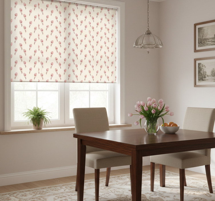 Rollo fenster esszimmer mit kleinem rosa tulpenmuster