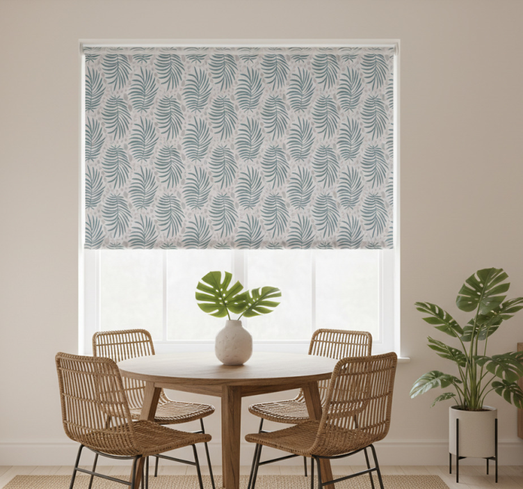 Rollo fenster esszimmer mit tropischen palmenblättern