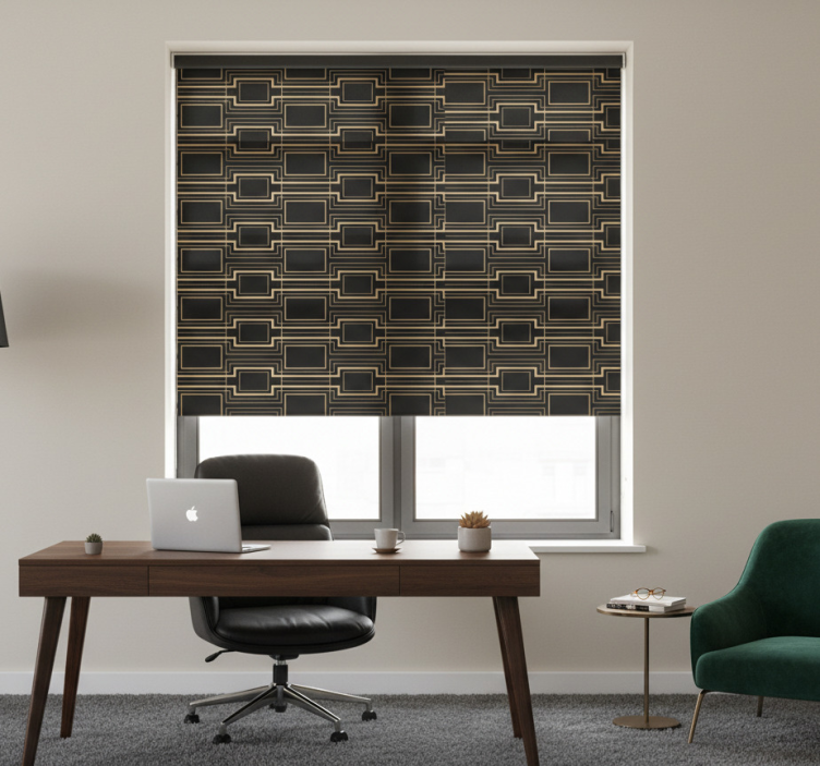 Referenz: E7326Entdecken Sie das elegante Rollo Fenster Home Office mit goldenen Rahmenmuster, das Ihr Arbeitsumfeld stilvoll aufwertet. Dieses einzigartige Design kombiniert funktionale Eigenschaften mit einem ansprechenden Äußeren. Die goldenen Rahmenmuster verleihen dem Rollo einen Hauch von Luxus, während es gleichzeitig vor direkter Sonneneinstrahlung schützt. Genießen Sie die Privatsphäre, die es im abgesenkten Zustand bietet, und gestalten Sie Ihr Zuhause so, dass es sowohl ästhetisch als auch praktisch ist. Mit einem Rollo Fenster Home Office mit goldenen Rahmenmuster entscheiden Sie sich für eine harmonische Raumgestaltung!
