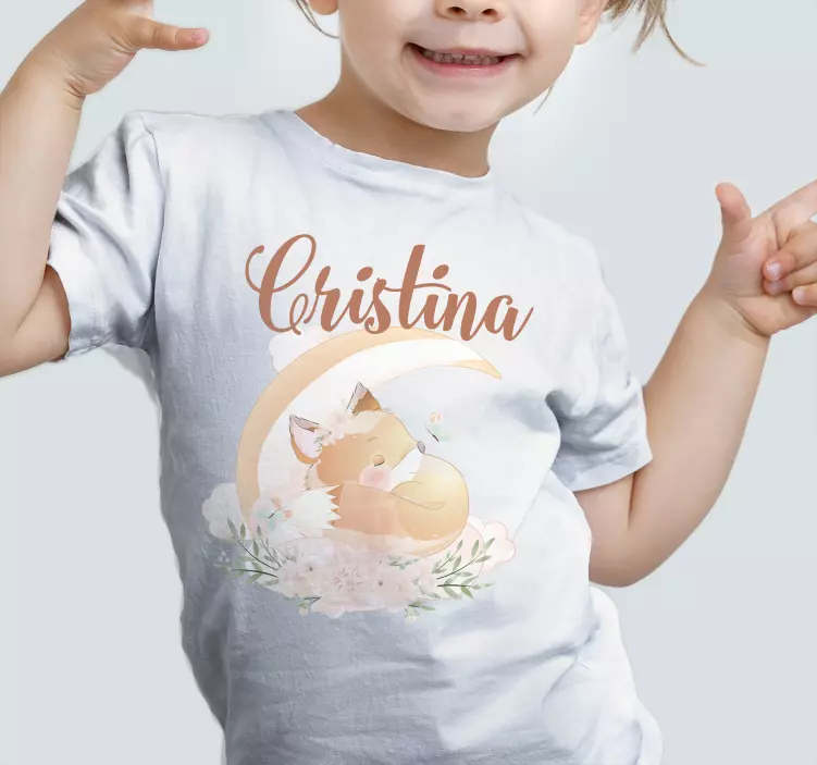 Referenz: T4668Dieses bezaubernde Design zeigt einen schlafenden Fuchs, geschmückt mit Blumen und einem Halbmond. Die sanfte Farbpalette verstärkt den Charme und macht es perfekt für Kinder. Der personalisierte Name fügt eine einzigartige Note hinzu, die Eltern anspricht, die nach maßgeschneiderter Kleidung für ihre Kleinen suchen.