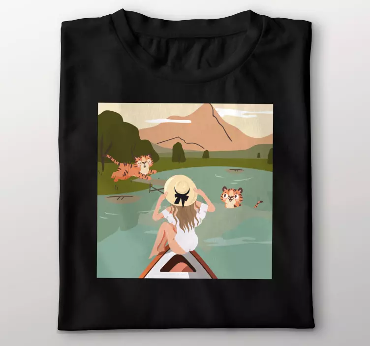 Referenz: T4948Dieses Design zeigt eine ruhige Außenszene mit einer Frau in einem Hut, die einen friedlichen Moment auf dem Wasser genießt. Zwei verspielte Tiger erscheinen und fügen diesem friedlichen Setting ein Element des Spaßes hinzu. Das Kunstwerk fasziniert mit seinen schönen Farben und lebhaften Charakteren.
