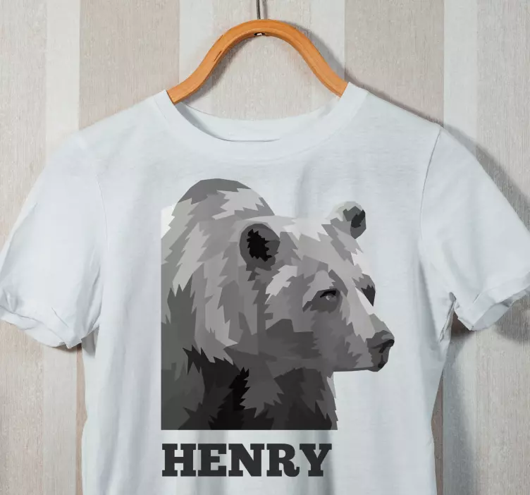 Referenz: T4983Dieses Design zeigt einen Bären, der in einem geometrischen Stil dargestellt ist, und bietet eine einzigartige Darstellung. Der Name 'Henry' begleitet das Tier und verleiht ihm eine persönliche Note. Die Grautöne fügen ein zeitgenössisches Element hinzu, das es für ein breites Publikum ansprechend macht.