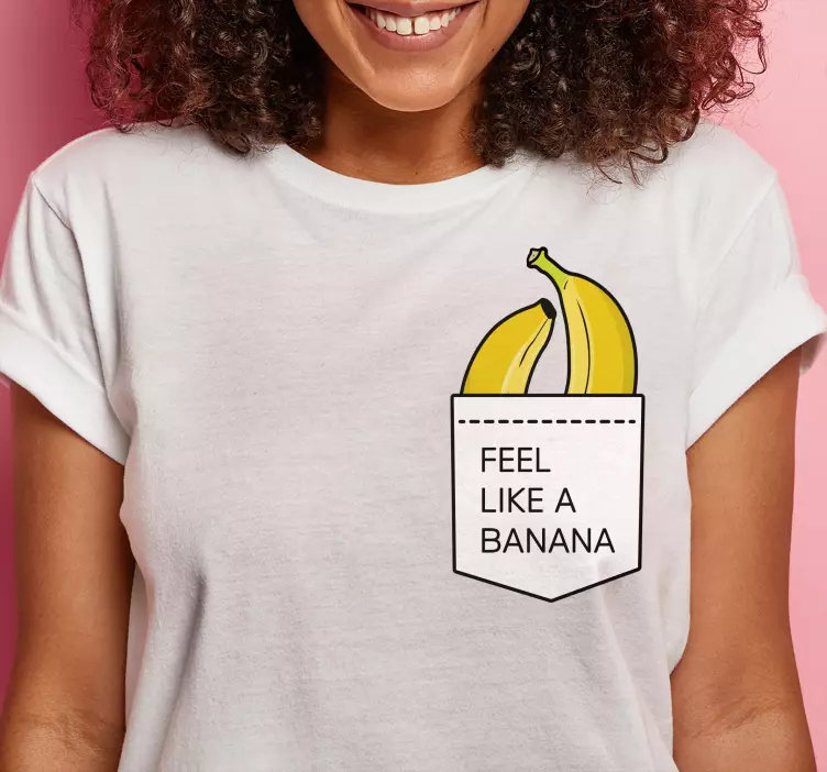 Referenz: T4147Dieses Design zeigt lebendige Bananen, die aus einer Tasche hervorlugen, mit dem Text 'Feel Like A Banana.' Die verspielte Bildsprache vermittelt eine unbeschwerte und fröhliche Stimmung, perfekt für Freizeitkleidung. Ideal für diejenigen, die Spaß und skurrile Modeaussagen lieben.