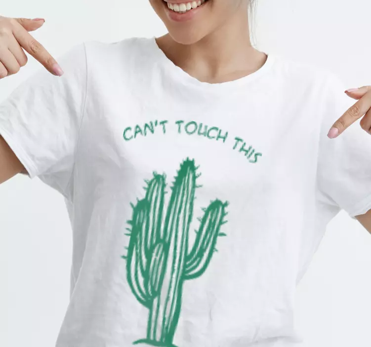 Referenz: T4734Dieses verspielte Design zeigt einen Kaktus mit dem Satz 'Can't Touch This' darüber. Die lebendige grüne Farbe steht in schönem Kontrast zum weißen Stoff und schafft ein amüsantes Statement-Stück, das perfekt für die Freizeit ist. Ideal für diejenigen, die Humor und einzigartige Stile schätzen.
