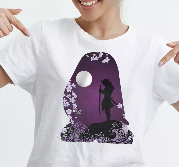 Referenz: T4771Dieses stilvolle Stück zeigt die Silhouette eines Kriegers zwischen Kirschblüten und einem Mond auf einem lebhaften lila Hintergrund. Die floralen Elemente verleihen einen Hauch von Eleganz und machen es perfekt für ausdrucksstarke Personen, die Kunstfertigkeit in ihrer Garderobe schätzen.