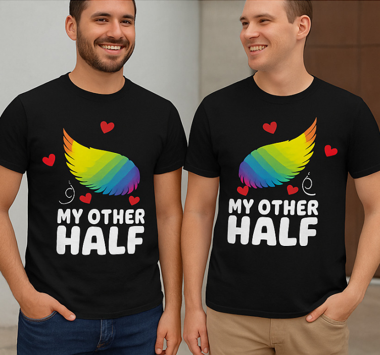Dieses Bild zeigt zwei T-Shirts, auf denen der Satz 'MY OTHER HALF' prominent dargestellt ist. Jedes Shirt ist mit einem lebhaften, regenbogenfarbenen Flügeldesign und roten Herzen verziert, was ein fröhliches und liebevolles Thema betont. Der kontrastierende schwarze Hintergrund hebt die bunten Grafiken hervor und schafft eine visuell beeindruckende und bedeutungsvolle Darstellung von Partnerschaft.