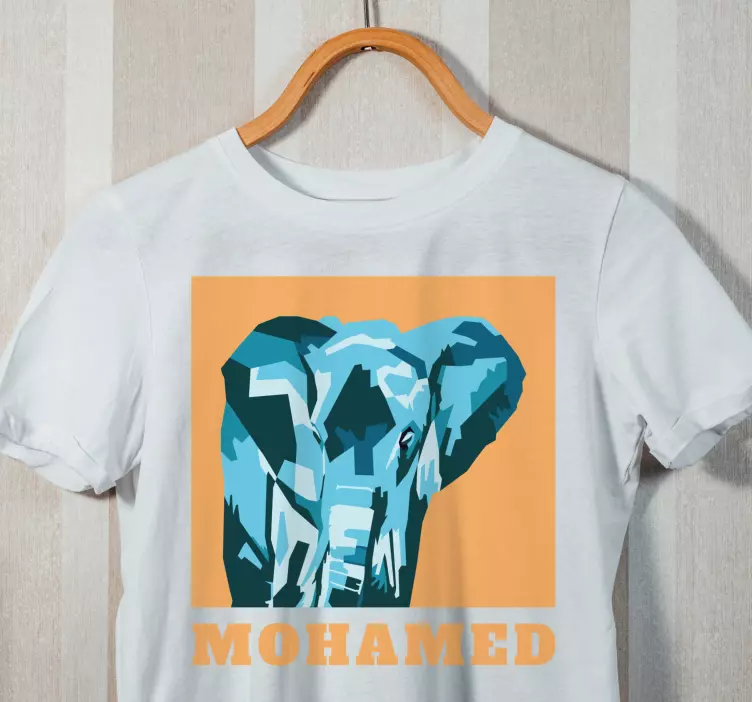 Referenz: T4979Dieses Design zeigt ein auffälliges Elefantenporträt, das aus lebhaften geometrischen Formen besteht. Die Farbpalette umfasst verschiedene Blautöne, die durch einen orangefarbenen Hintergrund ergänzt werden, was es zu einem fesselnden Kunstwerk macht. Der Name 'Mohamed' wird prominent angezeigt und verleiht dem Ganzen eine persönliche Note.