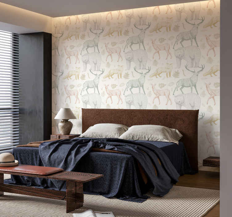Referenz: P7871Das Tiere Tapete minimalistisches walddesign besticht durch ein grafisches Design, das die Schönheit des Waldes und seiner Bewohner einfängt. Mit Bären, Hirschen und Füchsen bietet dieses Design eine natürliche und beruhigende Atmosphäre.