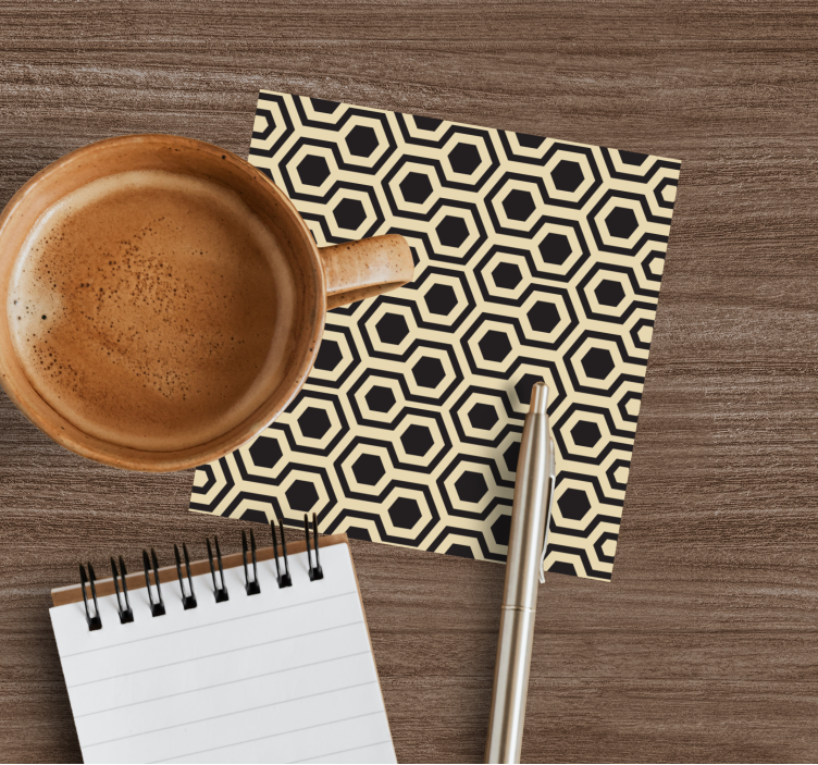 Entdecken Sie das stilvolle und moderne Untersetzer im wabenmuster design, das durch sein einzigartiges grafisches Design besticht. Mit einem eleganten sechseckigen Muster aus schwarzen und beige Farbtönen wird jeder Tisch zum Blickfang. Die geometrischen hexagon-Formen schaffen ein harmonisches und geometrisch ansprechendes Ambiente, das sich in jede Einrichtung einfügt und durch sein sich wiederholendes Muster für Freude sorgt!