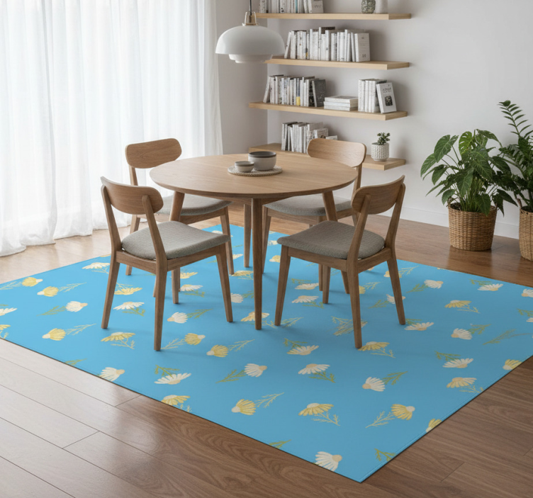 Der Vinyl Teppich Blumen Vinyl Teppich Blumen Gänseblümchen Blau Hintergrund ist die perfekte Wahl für alle, die ihrem Wohnraum einen besonderen Akzent verleihen möchten. Mit seinem einzigartigen Design zieht er die Blicke auf sich und verwandelt jeden Raum in eine Wohlfühloase. Die Verwendung dieses Teppichs fördert nicht nur die Ästhetik, sondern sorgt auch für ein angenehmes Raumklima. Er ist ideal für Wohnzimmer, Schlafzimmer oder sogar Kinderzimmer geeignet und bringt Fröhlichkeit in jeden Bereich!