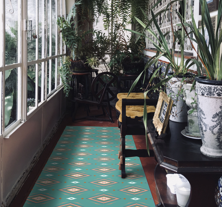 Das grafische Design dieses Vinyl Teppichs hebt sich durch sein Diamant- und Rhomboidmuster hervor. Der blaugrüne Teppich verleiht jedem Raum ein orientalisches und symmetrisches Flair. Dieser Läufer ist ein Blickfang und verleiht Ihrem Zuhause einen einzigartigen Touch!
